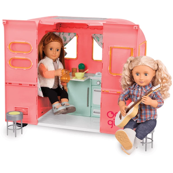 Der nächste Roadtrip kann kommen! Mit diesem Camping Anhänger schenkst du deinen Puppen von Our Generation ein fabelhaftes zweites Zuhause, während sie auf Entdeckungsreise gehen. Dank der Anhängerkupplung kann der Wohnwagen an einige der Our Generation Fahrzeuge angehängt werden (beispielsweise an die Jeeps), aber du kannst ihn auch einfach an einem hübschen Platz abstellen, wo deine Puppen entspannt verweilen können – zum Beispiel, um in der hübschen kleinen Küche die nächste Mahlzeit zuzubereiten. Der Tisch und die Bank lassen sich ausziehen, damit deine Freunde genug Platz zum Essen und Schlafen haben. Los geht’s, das nächste Abenteuer wartet schon auf euch! Inhalt: 1 Wohnwagen möbliert, 1 Abtropfständer mit 1 Tablett, 2 Messer, 2 Gabeln, 2 Löffel, 2 Teller, 2 Schälchen, 1 Kanne, 2 Gläser, 1 Kaktus, 1 faltbare Matte, 2 Kissen, 2 Hocker, 1 Backofenrost, 3 Kühlschrankplatten, 2 Kühlschrankschubladen, 1 AnhängerkupplungGröße Produkt (cm): 52,07 x 30,48 x 61,6Größe Verpackung (cm): 52,07 x 30,48 x 61,6