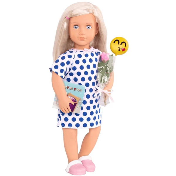 Wenn deine Puppen von Our Generation mal krank oder verletzt sind, brauchen sie vor allem eines: gute Freunde, die sie besuchen und ihnen vielleicht auch ein kleines Geschenk mitbringen. Wie wäre es zum Beispiel mit einem lustigen Ballon und einer Schachtel Pralinen? Damit zauberst du deinen kleinen Patienten ganz bestimmt ein Lächeln auf die Lippen, denn Schokolade macht ja bekanntlich glücklich. Und damit keine Langeweile aufkommt, bring ihnen doch einfach noch ein schönes Malbuch mit. Gute Besserung! Inhalt: 1 Mundschutz, 1 Pralinenschachtel mit abnehmbarem Deckel, 1 Emoji-Luftballon, 1 Krankenhaus-Armband, 1 pinkfarbene Rose, 1 Paar Hausschuhe, 1 Malbuch, 1 Karte “Gute Besserung”, 5 Malstifte, 1 Zahnbürste, 1 Tube Zahnpasta, 1 Flasche MundwasserGröße Produkt (cm): x x Größe Verpackung (cm): 11,76 x 12,7 x 5,08