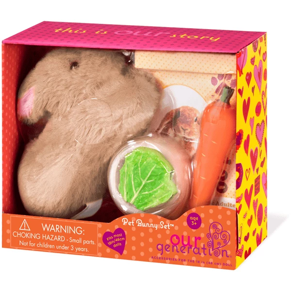 Wir alle brauchen ein Häschen zum Liebhaben! Dieser bezaubernde Plüschhase ist das perfekte Haustier für deine Our Generation-Puppen oder ein tolles Geschenk für Kinder, die Häschen lieben! Das niedliche Kaninchen hat superweiches, plüschiges Fell und eine süße, rosa Nase! Kümmere dich gut um deinen neuen Hasen-Freund! Mit dem frischem Gemüse, wie z.B. einer Schüssel Salat und einer Karotte hat das Häschen immer leckeres Essen. Mit der Tüte hochwertiger OG-Tiernahrung kannst du den Speiseplan deines Häschens ausgewogen halten. Mit dem Our Generation Haustier Set Hase hast du und deine Puppen kuscheligen Spaß!Inhalt: 1 Hase, 2 Salatblätter, 1 Karotte, 1 Napf, 1 FutterbeutelGröße Produkt (cm): x x Größe Verpackung (cm): 5,08 x 11,76 x 12,7