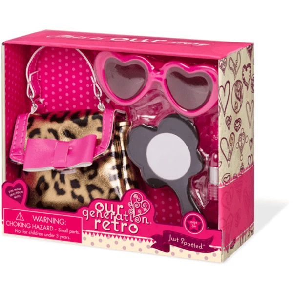 Du liebst den Leo Look? Mit diesem Leo Accessoires Set mit Handtasche von Our Generation werden alle Träume wahr. Die süße Handtasche mit Leo-Print und pinker Schleife lässt dein Outfit strahlen. Im Set ist zudem eine pinke Sonnenbrille in Herzform, ein Spiegel und ein Lippenstift. Inhalt: 1 Handtasche, 1 Herz-Sonnenbrille, 1 Spiegel, 1 LippenstiftGröße Produkt (cm): x x Größe Verpackung (cm): 11,76 x 5,08 x 12,7
