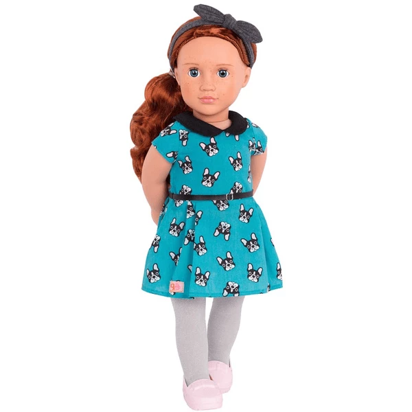 Deine Puppen von Our Generation lieben Mode – und ihre Haustiere. Warum also nicht einfach beides miteinander kombinieren? Zum Beispiel mit diesem bezaubernden türkisfarbenen Sommerkleid mit Hunde-Print, das mit dem schwarzen Kragen und dem schmalen Gürtel einfach umwerfend schick aussieht! So geht Fashion! Inhalt: 1 Kleid, 1 Strumpfhose, 1 Haarband, 1 Paar SchuheGröße Produkt (cm): x x Größe Verpackung (cm): 30,48 x 25,4 x 4,45