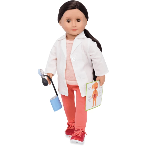 Auch eine Puppe kann krank werden – zum Glück gibt es Nicola! Die fabelhafte Ärztin mit dunklen Haaren liebt es, für ihre Patienten da zu sein und dafür zu sorgen, dass es ihnen schon bald sehr viel besser geht. Natürlich hat sie immer alles dabei, was eine gute Ärztin braucht! Möchtest du sie begleiten und ihr helfen, damit all die kleinen Patienten ganz schnell wieder gesund werden?Inhalt: 1 Puppe, 1 Top, 1 Hose, 1 Arztkittel, 1 Unterhose, 1 Paar Schuhe, 1 Stethoskop, 1 Otoskop, 1 Blutdruckmanschette, 1 Stift, 4 Röntgenbilder, 1 Anatomie-Poster, 1 RezeptblockGröße Produkt (cm): 46 x 18 x 10Größe Verpackung (cm): 50,8 x 27,94 x 12,7