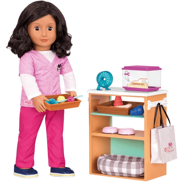 UnterstĂĽtze deine Puppen von Our Generation dabei, ihre eigene Tierhandlung zu eröffnen! Hier bekommt man alles, was die treuen Vierbeiner glĂĽcklich macht. In dem Regal kannst du die Accessoires schön präsentieren. Was möchte der erste Kunde wohl kaufen – vielleicht ein kuschelweiches Hundekörbchen?Inhalt: 1 Theke mit Kasse, 1 Hamsterkäfig mit Rad, 2 Weidenkörbe, 2 Futternäpfe, 1 Aquarium, 1 Netz fĂĽr Fische, 2 Fische,1 Beutel mit Fisch, 1 Haustierkörbchen, 1 Einkaufstasche, 2 Spielzeuge, 2 Spielbälle, 1 Spielfisch, 1 Spielknoten, 2 Spielknochen, 1 HaustiertragetascheGröße Produkt (cm): x x Größe Verpackung (cm): 38,1 x 43,18 x 11,43