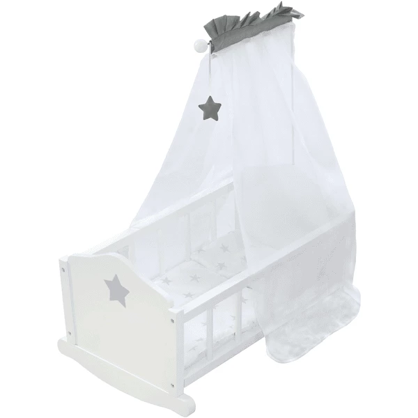 mit Sternen bedruckt. Passend zu diesem Puppenbettchen mit Wiegefunktion gibt