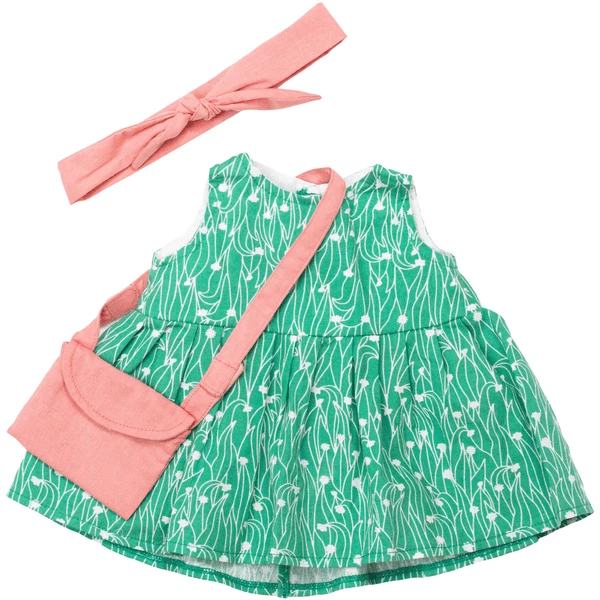 Set besteht aus einem grünen geblümten Kleid, einem rosa Haarband mit